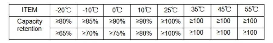 | Capacity retention 60℃,100%SOC,7days | ≥96% |