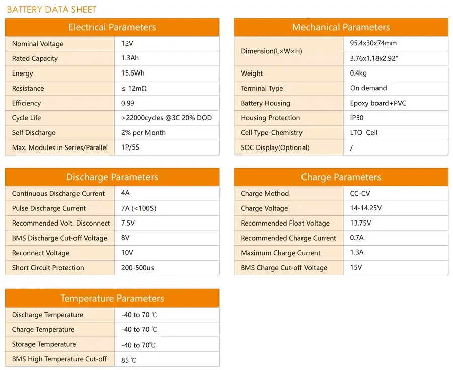 Long cycle free maintenance lithium titanate battery 12v 1.3Ah