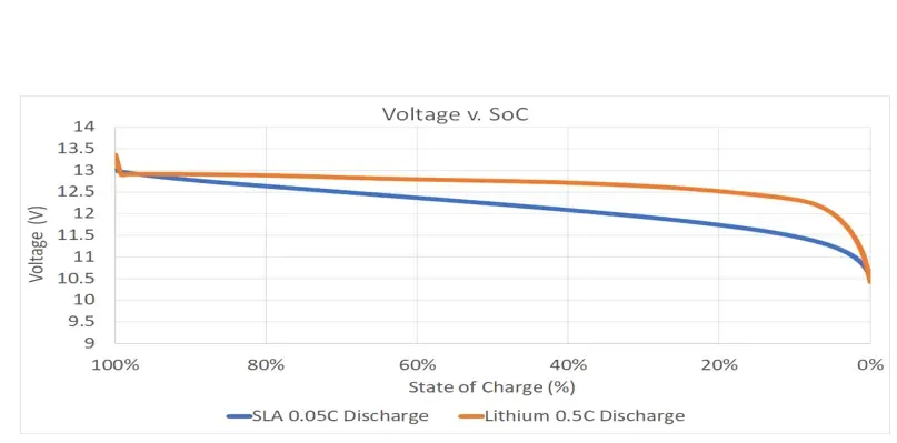 Lithium delivers the same amount of power throughout the entire discharge cycle, whereas an SLA’s power delivery starts out strong, but dissipates. The constant power advantage of lithium is shown in the graph below which shows voltage versus the state of charge.