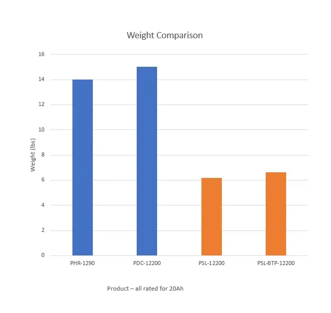 Lithium, on average, is 55% lighter than SLA. In cycling applications, this is especially important when the battery is being installed in a mobile application (batteries for motorcycles or scooters), or where weight may impact the performance (like in robotics). For standby use, weight is an important consideration in remote applications (solar fields) and where installation is difficult (up high in emergency lighting systems, for example).